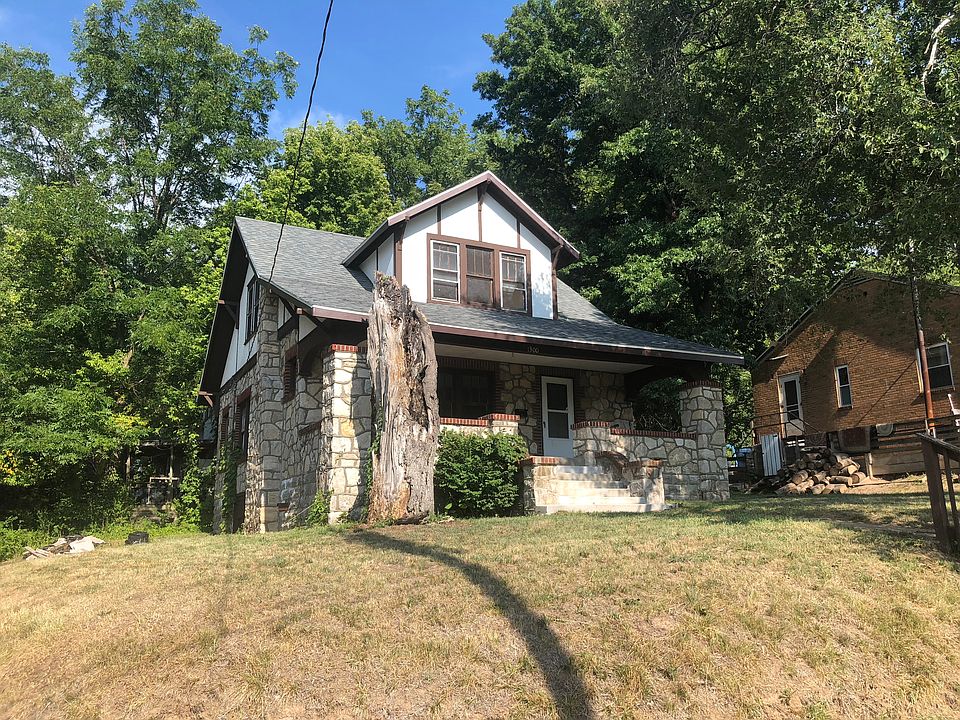 Property is selling AS IS. The price reflects the needed improvements. Exterior stone & brick is amazing and in great condition. Hardwood floors are able to be sanded and saved. Wood burning fireplace of unknown condition. Private road in front of house up off of Main St. Road is narrow, but there is parking and turn around room. There is a street on the south side of home on which you can park and there are stairs from the street. Unique location. No utilities on. Take flashlight for basement. Buyer is welcome to have any inspections.