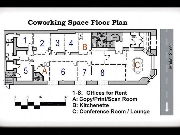 16x13 Office with hardwood floor in 1st floor co-working suite in convenient Downtown Wheeling location. Includes all utilities/wifi and use of the conference room and kitchenette. Identified as #6 on floor plan. Parking space available for lease.