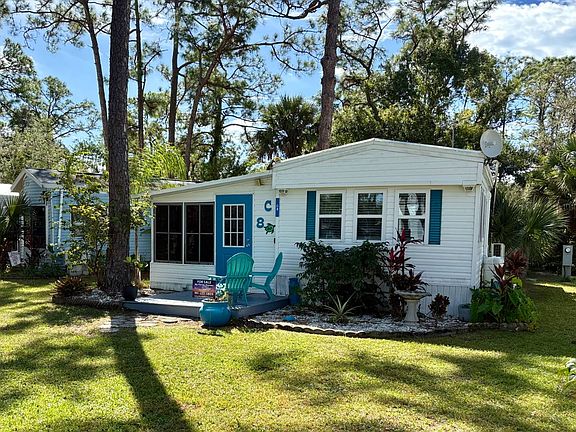 Seaside Serenity Meets Cozy Charm fully turnkey! Nestled in the heart of Ramblers Rest, this enchanting one-bedroom, one-bath park model on Lot C8 is a delightful blend of charm, comfort, and coastal elegance. From the moment you arrive, the vibrant blue front door beckons you into a space that feels far more expansive than its footprint suggests. Surrounded by a lovingly tended garden and framed by a welcoming front porch, this turnkey treasure invites you to sip your morning coffee on the deck as you wave to friendly neighbors passing by. Step inside and discover a home that radiates warmth and tranquility. The Florida room, bathed in natural light through vinyl windows and accented with chair rail and wainscoting, offers a breezy retreat perfect for relaxing or hosting overnight guests-thanks to the clever double pocket doors that provide privacy when needed. A small AC unit keeps the space cool, while the electric wall-mounted fireplace adds a cozy glow on crisp mornings. The living area is anchored by a plush sectional sofa, ideal for curling up with a good book or enjoying movie nights. Six windows flood the room with sunlight, softened by elegant blinds for added privacy. A sleek split AC unit ensures year-round comfort. The kitchen is a showstopper-gleaming with two-tone blue and white cabinetry, stainless steel appliances, a stylish backsplash, and a pass-through window that connects to the Florida room. A portable drop-leaf island adds versatility, while a dedicated pantry and walk-in closet offer ample storage. The bedroom continues the serene blue theme, featuring a queen bed, double closet, built-in drawers, and a large mounted TV for unwinding at day's end. The bathroom is equally inviting, with a tiled step-in shower, vanity, and thoughtful storage for all your essentials. Out back, a second patio awaits-an intimate oasis surrounded by swaying palms and lush plantings. Two sheds, mood lighting, a grill, and a dining set create the perfect setting for alfresco evenings under the stars. With vinyl plank flooring throughout and a few soft spots in the Florida room (for which the owners are offering a repair discount), this home is a rare find. Ramblers Rest offers a wealth of amenities with no age or pet restrictions, making it perfect for snowbirds seeking peace and quiet or families looking for fun during school breaks. The park is easily accessible from I-75 and is within reach of three airports in any direction. Enjoy access to a boat ramp, storage, and a fishing dock on the Myakka River, as well as a clubhouse, pool, spa, splashpad, pickleball courts, tennis courts, horseshoes, and a putting green. There's also a wood shop, fitness center, and a variety of other activities to enjoy. Nearby attractions include the Atlanta Braves minor league stadium, which serves as a fantastic entertainment venue, along with Costco and a farmers market conveniently located on your way in. Because Ramblers Rest limits residency to six months, the rental possibilities for this home are endless with park approval. All listing information given to us is considered appropriate and reliable but should be independently verified through personal inspection by appropriate professionals. Home must be maintained to the Community Prospectus. The lot rent is determined by the Community office and covers all amenities offered including property taxes and lawn maintenance.