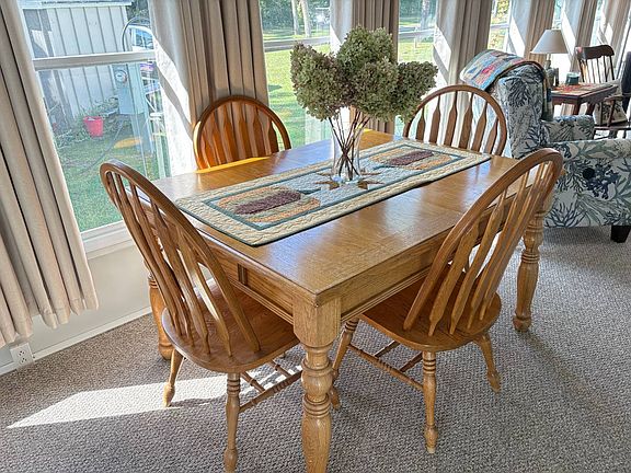 Step into a one-of-a-kind park model home that redefines comfort and style in the heart of Ramblers Rest. Nestled on an expansive, beautifully landscaped lot, this updated gem offers a rare blend of privacy, functionality, and flair. From the moment you arrive, the brand-new covered carport and included 2018 golf cart set the tone for easy living. Welcoming the outdoor spaces is a low-maintenance Trex deck spanning the front-perfect for morning coffee or friendly chats with neighbors. Out back, a secluded patio with umbrella, grill, and cozy furnishings invites you to unwind amid lush greenery and open lawn views including a BBQ. A separate storage unit is ready for beach gear, golf clubs, or tools. A sunlit Florida room & flexible living awaits inside. The enclosed Florida room dazzles with full-length plexiglass windows, screens, shades, and draperies, creating a bright, airy ambiance. A dining area with leaf table, TV, and fireplace makes this space ideal for entertaining or relaxing. A partitioned nook offers endless possibilities-crafts, office, or guest overflow-with a stacked washer/dryer tucked conveniently nearby. This room is complete with new subfloors and brand new berber carpeting. Enter into another open floor plan with living space and front facing kitchen. The unique front kitchen layout brings in extra natural light through windows above the sink that overlook the front deck. Enjoy ample counter space, wood-grain cabinetry, a portable island with stools, and all appliances included. Adjacent is a second living area with sofa bed, chair, TV, and bookcase-perfect for hosting or lounging. The comfortable bedroom is equipped with smart storage. The bedroom features a queen bed, double closet, built-in drawers, overhead cabinets, wall sconces, and a third TV. Pocket doors in both the bedroom and full bath maximize space and flow. The hallway has a double closet and into the full bath there is a tub/shower with corner sink and vanity. Vinyl plank flooring throughout the remainder of the home adds a fresh, modern touch. The extras and turnkey convenience as this home comes fully furnished and decorated, complete with linens, dishes, and thoughtful extras. (please see exclusions listed of personal items and craft equipment) Don't Miss This Rare Find This uniquely designed, highly desirable cottage is truly a standout. Ramblers Rest is a perfect place for snowbirds or rental opportunities from 1-6 months with park approval. Discover the joys of residing in an active, family-friendly park conveniently located in South Venice, just minutes away from the Gulf of America and its sandy beaches. Enjoy the mini golf course and designated play area for kids. Unwind by participating in a game of chess on a large outdoor board. Relax and rejuvenate in the large pool and spa. Explore the serene waters of the Myakka River with convenient on-site kayak storage and launch facilities. Stay active and take advantage of fishing opportunities or visit the fitness center for a workout. All this is onsite to make this property an ideal retreat for a vibrant Florida lifestyle. All listing information given to us is considered appropriate and reliable but should be independently verified through personal inspection by appropriate professionals. The lot rent is very reasonable and covers all amenities offered and other expenses including lawn maintenance, trash, water and sewer.