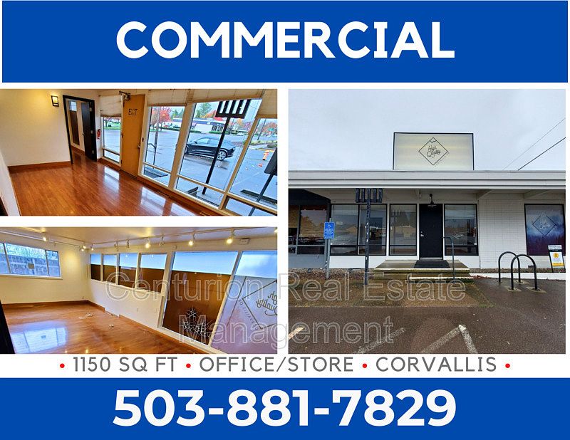 Address: 1300 NW 9th St Corvallis, OR 97330 Property Type: Commercial Rent: $1,975/mo Deposit: $1,975 (On Approved Credit) Application Fee: $55/ per adult 18+ Tenancy: 3-Year Lease. Sq. Ft: 1,150 Tenant Paid Utilities: Tenant is responsible for all utilities Ready Date: Available Now Viewing Status: Contact us for Viewing! Parking: Parking for tenants and their customers on the street DESCRIPTION: Updated Retail Space with freshly painted interior and recently installed lights. 2 large, separate office spaces. Open floor plans can accommodate your store's needs and want! INTERESTED IN THIS PROPERTY? Feel free to drive by the property to check it out. You can also stop by the office to pick up a paper copy. This information is deemed reliable, but not guaranteed. Centurion Real Estate Management, LLC 2380 NW Kings Blvd. Ste. 301 Corvallis OR 97330