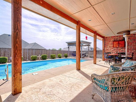 Welcome to your own retreat just in time for summer at 1300 Presidio Drive! This stunning custom built home offers great amenities both inside and out! This flexible 3-bedroom, 3-bathroom floor plan includes a dedicated office and a true MOTHER-IN-LAW suite with its own private ensuite, walk-in shower, and closet—perfect for guests or multi-generational living. Heated saltwater pool with AUTOMATIC pool cover and robotic sweep. Expansive covered back patio with stamped concrete & pool deck, making the perfect space for outdoor entertaining and privacy. The home features wood-look tile with a hand scraped finish in all living areas, all new carpets installed Nov. 24’, high ceilings throughout with stunning cathedral ceilings in the living room with wood beam accents, gas fireplace, and windows along the south side of the home overlooking the pool and patio. Large open kitchen with bar seating and dining space. The kitchen features a large center island, 5-burner gas range, Dbl Ovens, built-in microwave, and recently replaced dishwasher July 24’. You’ll appreciate all the counter space and storage with custom pull-out lower cabinet drawers with soft-close hinges, and walk-in pantry storage. The primary suite is a retreat of its own, featuring rounded tray ceilings, a spa-like bathroom with a jetted tub, walk-in shower with stone surround and rain head, walk-in closet with built-ins, and direct patio access. Additional features include Spray Foam insulation, Low-E double pane windows, sprinkler system, storm shelter, New Roof installed Nov. 24’, built-in desk and cabinets in the office. Pool is professional maintained, opened, and winterized each year, regular HVAC services and tune-ups 2x a year. Easy access to HWY 9 and minutes from the OU Campus and Cobblestone Creek Golf Course! Ask your Realtor for the full list of features and recent updates. This home is truly a must see!