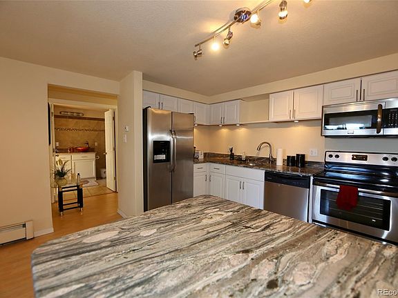 This one is gorgeous! Spectacular remodel boasting slab granite counters, including on the eat-in kitchen island/built-in table with extra storage. With its under cabinet lighting, newer stainless steel appliances, newer, soft-close cabinets & tile floor, this open kitchen is a delight. There is a completely remodeled bathroom with a darling bowl basin. Spacious, quiet bedroom with mirrored doors and a huge closet. The covered balcony faces a heavily treed greenbelt. Fabulous location with a friendly community, close to amenities, including a huge, private courtyard with an indoor and outdoor pool, tennis and volleyball courts, work-out gym, several ponds with fountains & bridges. Only one common wall! elevator access and secured entrance Cherry Creek schools. includes heat, water, sewer, trash, secured central location with bus stop/public transportation just around the corner and walking distance to Highline Canal trails, shopping & dining. Easy access to highways, DTC, and downtown. Desirable Cherry Creek Schools.