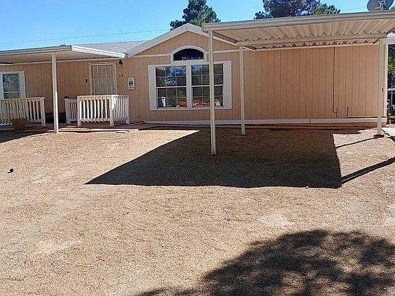 f one of Pahrump's most sought after areas, Sunset Mobile Homes 55+ Community. 2003 CAVCO double wide, 48 x 14 ft, 3 bdrm, 2 full baths, mobile only, does not include land, but is nicely positioned crossways on a huge lot that offers a lush green front lawn shaded by huge pine trees, and a large strip of lawn in back common area that separates the two rows of homes. A large living room, and great kitchen with space large enough for dining table. Beautiful wood cabinets, granite countertops, stainless steel refrigerator with icemaker, dishwasher and electric stove with overhead microwave included. Laminate floors for easy maintenance. Ceiling fans throughout. Large primary bath has low-threshold step in shower with sliding glass door option. Big walk-in closet and plenty of cabinet storage. Twin sink vanity with storage beneath. Main bath has tub/shower combination and vanity. Front entry sits at ground level with no steps to climb, providing easy access. There's front and back porches to sit on to enjoy the view. Large covered carport in front with plenty of room for a second vehicle or golf cart. The back porch has steps down to a nicely sized fenced backyard for your pets, and includes a roomy storage shed for your Christmas decorations, tools or hobby shop. Laundry room is adjacent to the kitchen and leads outside to the back porch. Maytag washer and dryer stay. A doggie door is already installed and provides access to the back yard. Security screen doors on front and back allows you to safely enjoy mild open-door weather. No HOA, but current space rent is $549 per month which includes water and sewer. Buyers must meet park residency requirements.