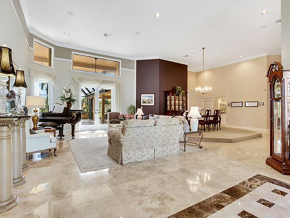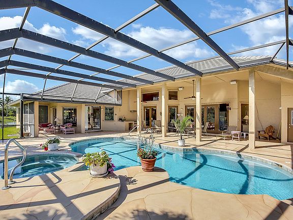 Be prepared to be impressed! Beautiful custom home featuring 5 bedrooms, 3 1/2 bathrooms, and pool cabana bath on a premium .65 acre lot in Meadow Wood. This gorgeous floor plan features spacious bedrooms, private home office, screened lanai area, stunning heated pool with spa, private cul-de-sac lot, circular driveway, and many other upgrades thru-out. Upon entry you will find volume ceilings with beautiful tile flooring thru-out the living areas. A gorgeous master suite with soaring ceilings, perfect master bath, and a walk-in closet that everyone will love! Built in surround sound speakers thru-out the home. Roof replaced in 2012 & screen enclosure replaced in 2009. Main A/C replaced in 2014 & Master bedroom A/C replaced in 2018. Pool pump replaced in 2017. Excellent Wellington schools!