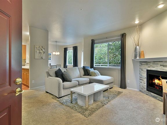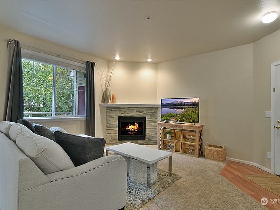 Welcome to this impeccable and stylish condo! This 2 bedroom, 1.75 bath unit is a fantastic opportunity for modern living and a low maintenance lifestyle. Step into the inviting living room with a beautiful stone gas fireplace. Comfortable open layout with a serene view from the large windows, adding a touch of nature to your urban living. Main bathroom is tastefully remodeled. Other updates include newer paint, stainless steel kitchen appliances, full size washer & dryer. Enjoy a morning coffee or unwind in the evenings on your peaceful balcony. Well-maintained complex and low HOA dues. BONUS: 2 assigned covered parking spaces. Easy access to parks, shops, freeways, Park & Ride, Boeing & Paine Field.
