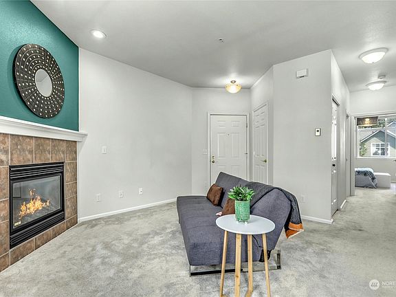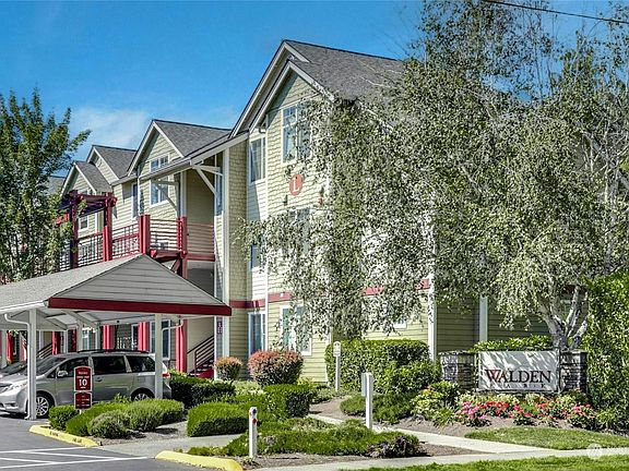 Beautifully maintained top floor condo with striking vaulted ceilings. This open concept condo lives large with a living room that opens to the dining room and kitchen. The inviting gas fireplace is a great spot to entertain guests as well as the outdoor balcony. The spacious bedroom offers a wall of closets and there is additional storage throughout the home. The convenient office alcove offers plenty of space for your chores or in-home projects. Located in the desirable Walden Park community with well maintained buildings & landscaping, along with low HOA dues. The HOA dues include water, sewer, garbage, a covered parking space & access to athletic courts. Easy access to I5, 10 minutes to Boeing, Paine Field, parks, & shopping.