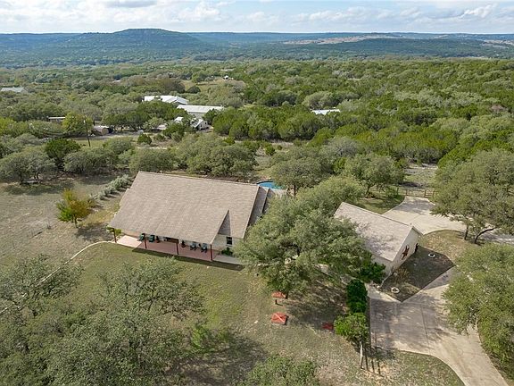 Amazing sunrises and sunsets are seen from inside the house or sitting on the front and back porches, where miles of Texas Hill Country can be seen, along with very few homes and grand Texas skies. This is a lovely sprawling 2950SF ranch style home with a detached garage is on 3.8 Acres, sits on the side of the hill allowing wonderful privacy and big views. The in ground pool has been enjoyed since 2013 and is seen from the kitchen, 2 living spaces and the primary bedroom. It is an easy living here with room to enjoy for many years to come. There is a flat paddock on the south side of the property and a field that slopes down to the west giving horses access to the 2 stall barn. You don't want horses???....... the barn could be converted to a fabulous art studio! You need more bedrooms, well the detached garage was built as a cottage and lived in while building the main house, think guest house office with room for another garage. This is a haven, with its many upgrades from the Anderson windows and doors, whole house vacuum and sprinkler system is just waiting for your next version of home.