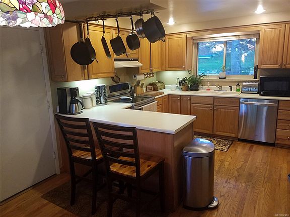 Beautiful Mid-Century 4 bed, 3 bath ranch-style home in highly desirable Applewood neighborhood. Stunning one-of-a-kind private backyard with new brickwork, patio, raised garden bed, automatic sprinkler, and towering trees backing to open space, canal, and walking path. Main living room with French doors opens to a remodeled, heated, and newly tiled sunroom boasting 6 sliding glass doors for all season enjoyment. Kitchen features wood flooring, stainless steel appliances, new double oven, new dishwasher, and custom hanging pot rack. 2 large living rooms each with its own fireplace plus a fully remodeled basement. Freshly painted. Energy efficient double pane windows, new attic insulation, new roof (2017), new A/C (2017), new water heater (2016), new furnace motor (2017). Easily accessible to 6th Ave/I-70/C470 highways. Only 2 owners in home's lifetime, and a home that's great for entertaining. Custom projector screen in backyard. Move-in ready.