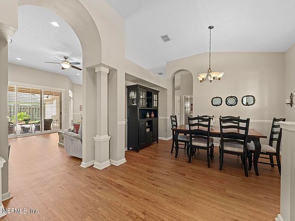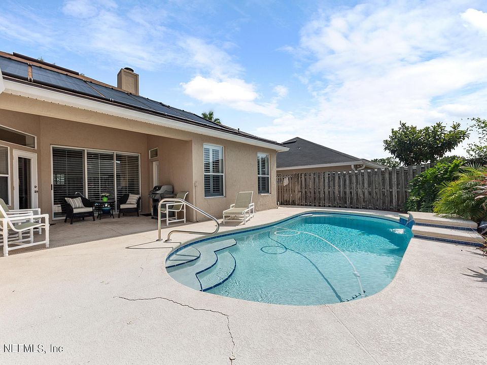 Beautifully updated 4/2 concrete block pool home in popular Johns Creek! Granite counters and tile backsplash set off this kitchen and the plantation shutters add a finished touch to the home. Wood look luxury vinyl plank floors throughout bring durability and beauty to this home. Use the front flex space as an office, play area or formal living room. The wood burning fireplace is cozy in the cooler winter months while the pool is appreciated in the summer! Oh - and with the solar heating system, you can swim in the cooler months too! The laundry room has additional pantry storage, upgraded lighting throughout the home!