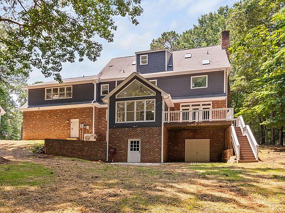 Massive brick home featuring 4 bedrooms, 5.5 bathrooms, a two-car attached garage, a three-car detached garage, and a basement garage. Just a short walk to Falls Lake, the property is surrounded by mature trees and nature. A charming front porch overlooks the grassy front yard, while a new front door and updated exterior lighting provide a warm welcome. Inside, nearly every floor has been upgraded to LVP, except for the lofts on the fourth floor and the laundry rooms. Oak stair treads with wrought iron balusters add an elegant touch to the entryway. To the left is a home office; to the right, a formal dining room. The updated kitchen showcases quartz countertops, a subway tile backsplash, refinished cabinetry, stainless steel appliances, updated lighting, and new hardware. The living room features a wood-burning fireplace with a propane connection for convenience. A vaulted-ceiling sunroom, with three new windows and new exterior doors to the deck, offers the perfect retreat or second dining area. The back deck overlooks a partially grassy backyard bordered by woods for added privacy. The spacious main-floor bedroom includes a fully updated bathroom with dual vanities and a luxurious tub surrounded by tile to the ceiling. Upstairs, the second floor boasts a huge bonus room with built-in bookshelves and cabinets. The private master suite features crown molding, a new ceiling fan, a walk-in closet, and a luxurious bathroom with vaulted ceilings, a brand-new 96'' dual vanity, and a spa-like shower. Two additional bedrooms share an updated bathroom, and a large laundry room with ample storage completes this level. The third-floor ''penthouse'' includes two large flex rooms, an open loft, skylights, high ceilings, generous closets, and unique loft spaces. An updated bathroom with dual vanity completes this level. Note: The penthouse and basement bonus areas were finished by a previous owner around 2000 without permits. The finished basement offers a bonus room, flex room, and newly updated full bath, plus an unfinished section with dual doors and a roll-up garage door leading to a carport beneath the deck. A second washer/dryer hookup and abundant storage are also included. The detached garage features three separate doors, a walk-in door, high ceilings, a built-in workbench, and stairs to an unfinished upper floor—perfect for storage or future expansion. Nearly every floor has been replaced, the entire home freshly painted inside and out, most lighting fixtures updated, all bathroom vanities replaced, and every bathroom renovated. All three HVAC units have been replaced within the past 3 years. This move-in-ready home blends timeless charm with modern updates in a serene wooded setting near Raleigh, Wake Forest, and Durham. Please note: The total finished area above grade is 4,406 sq ft, which includes 738 sq ft on the third floor that was finished without permits. The finished below-grade area is 627 sq ft, which was also completed without permits. The permitted finished square footage of the home is 3,668 sq ft, with a total of 5,033 sq ft when including all finished areas. Additionally, there is 1,588 sq ft of unfinished storage space and 1,437 sq ft of garage space. Altogether, this results in 8,058 sq ft of finished and unfinished space under the two roofs. The septic system for this home is permitted for a 4-bedroom home. The home is located 0.9 miles from the Barton's Creek Boat Ramp and 1.9 miles from Blue Jay County Park.