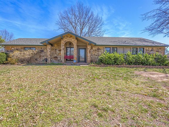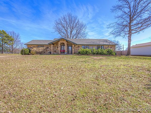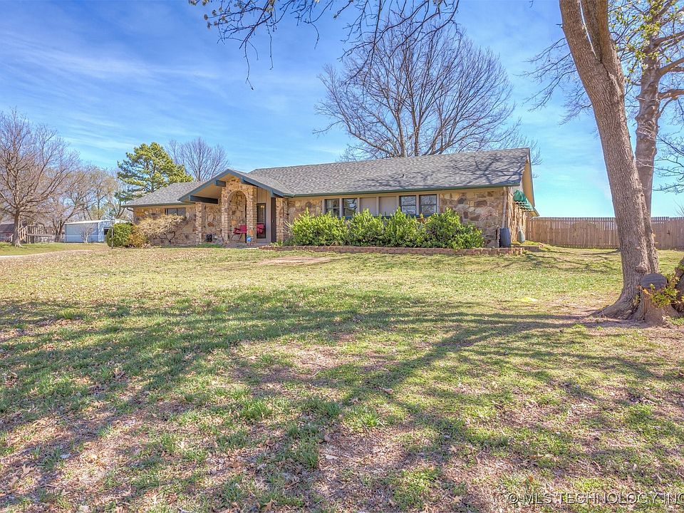 Beautiful ranch on .79 m/l acre corner lot! Broken Arrow address located in Bixby public schools. Enjoy the country feel from the swing on the covered front porch. Huge, sunny, well constructed game room addition that leads to the covered back patio has a wet bar, half bath, Pella windows and skylights for hosting gatherings and enjoying the outdoor view. Kitchen has granite countertops, and an eat in breakfast area. Formal dining is open to the living room with beamed ceilings and fireplace. The updated in suite primary bath has double sinks, walk in closet and an additional closet. The secondary bedrooms are nice size and have good storage. The lot has a large fenced in area for your pets, dog house and large storage shed. No HOA! This home has been maintained well and has updated mechanicals. Heat pump, septic and roof was new Sept. 2022. Mostly stone exterior with a side entry garage.