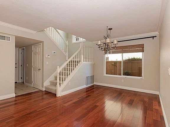 This highly upgraded home, nestled on a generous cul-de-sac lot, captures coastal breezes and offers proximity to top-rated schools, shopping, trails, and employment centers! Features include fully owned Solar installed by SunPower, Karastan carpeting, energy-efficient windows by Newman, ELFA system closet organizers, and professionally designed hardscape and landscape. Enjoy elegant curb appeal with lush landscaping, sandstone accents, ample parking, and a custom gate leading to the enchanting backyard. Enter to find gleaming hardwood floors, ample natural light pouring in from the dramatic vaulted ceilings, and a striking fireplace with a custom mantle. Entertain in the formal dining room illuminated by a charming Quoizel Chandelier and beautiful crown molding. The heart of the home is the open-concept family room with Travertine faced fireplace, leading into the kitchen, featuring a large custom sit-up island, refaced wood cabinets with pullouts, ceiling canned lights, ambient under-mount lighting, and a billiard chandelier. Granite counters complement the Stainless LG appliances and executive sink with a modern faucet. Four bedrooms upstairs. The primary suite exuding a vaulted ceiling and spa-like luxury in its bath, boasting a step-in shower, custom cabinetry, marble countertop, and illuminated vanity mirrors. The secondary bath received a tasteful remodel in 2019! Outdoor entertaining is a delight in the expansive yard featuring mature landscaping, a hand-cut sandstone patio with fire pit and tranquil waterfall, a garden box, and plenty of grassy area for play, all efficiently irrigated with an automatic system. The home has been meticulously maintained with annual maintenance checks on AC/heater, added security and fire system with upstairs and downstairs keypads, ceiling storage racks, electrical upgrades, and cable access in the garage. Ceiling fans in the primary bedroom, two secondary bedrooms, and family room.