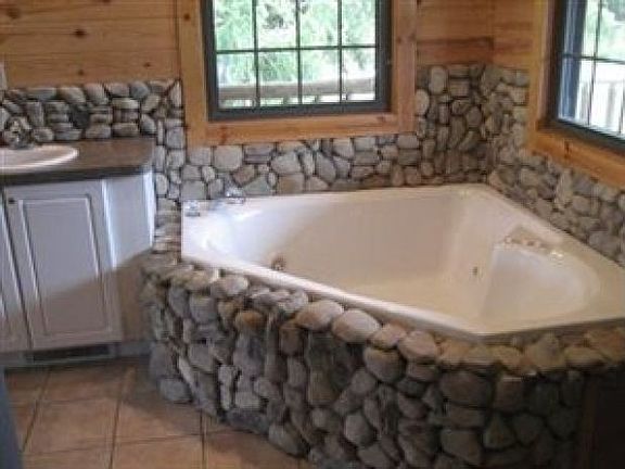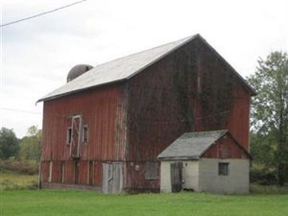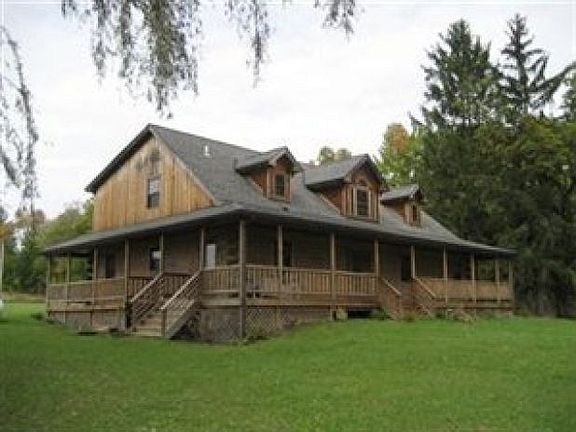 Rustic log cabin with large wrap around porch, 2 story great room with full stone wall fireplace, wide plank oak flooring. Each bedroom has its own bathroom. Over 5 acres, old bank barn needs work. Great horse property. Walkout basement is R33 Reward Wall sytem.
