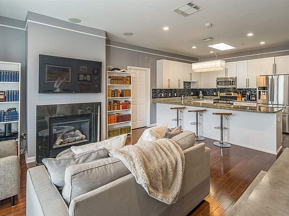 Exceptional penthouse 2 bedroom/ 2 bathroom condo in the Upper Grand. This spectacular home features a gourmet kitchen with granite counters, stainless steel appliances, custom tile back splash and an abundance of cabinet storage. Living/ dining room features high ceilings, over-sized windows, recessed lighting, gas fireplace, skylight, hardwood floors and a private terrace. Master bedroom easily fits king-size furniture, has a generous walk-in closet and en-suite bathroom. Guest bedroom features a spacious layout and walk-in closet. Additional features include central A/C, full size washer/dryer, 9-foot ceilings throughout and deeded garage parking. Building amenities include elevator, common courtyard and exercise room. Located moments from NYC via the NJ Transit bus, Lincoln tunnel and NY Waterways ferry.