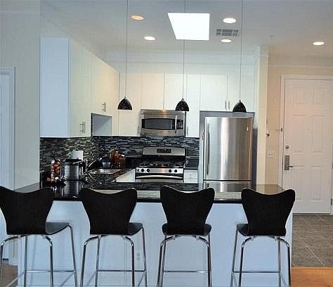 Highly Desirable Two Bedroom Condo - Offering a Stunning Kitchen, Newer Appliances, granite top including large breakfast bar, nice sized living area, fireplace, beautiful hardwood flooring throughout, many windows allowing for lots of sunshine, NEW washer/dryer in unit, Two nice sized bedrooms, two baths, central a/c, Elevator Access. Garage Parking Included & Fitness Room...NO FEE! (Owner Lic RE Agent)