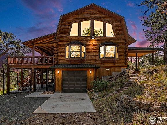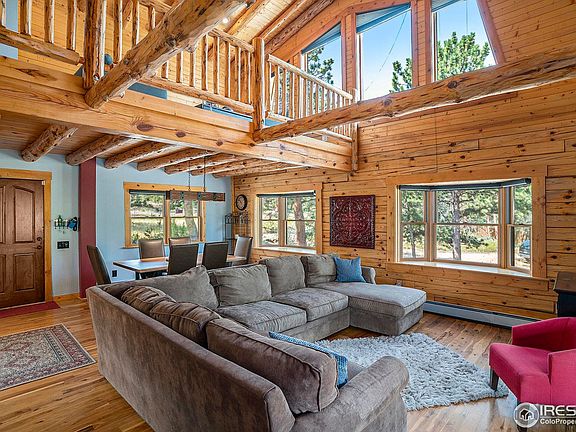 Escape to your sanctuary in the mountains with views of Rocky Mountain National Park from your covered deck. This log-built home has been recently updated with new carpet, remodeled bathrooms, incredible outdoor living with stamped concrete, fire-pit, hot tub, protected dog run with Astroturf and so much more. The open floor plan features vaulted ceilings with exposed beams, gourmet kitchen with granite countertops, main floor primary suite with flex room that would be great for an office, sitting room or exercise room. The loft upstairs is great for relaxing with generous natural light from the expansive windows. The one car heated garage and carport provides all the parking you need. Don't miss the fire pit on a nearly 3/4 acre lot with mature trees. All furniture and furnishings included in the sale.