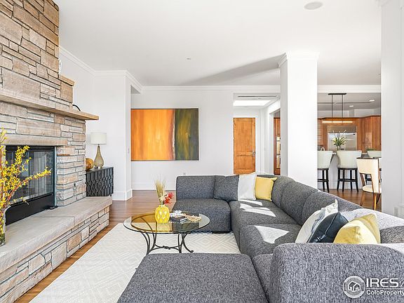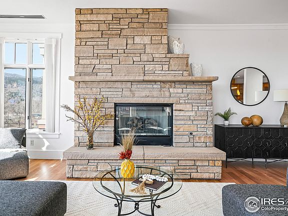 Sunlit spaces abound in this fourth-floor, south-facing penthouse in downtown Boulder. Single level living allows for a flowing floor plan with 10' ceilings, large windows and sweeping city and Flatirons views. Enter into an elegant, skylit foyer flanked by a designated office space and chef's kitchen. The well-appointed kitchen offers custom cherry cabinets, granite countertops, a Sub Zero fridge & Thermador gas range, double oven, dishwasher & microwave as well as a breakfast bar that seats 3.The living room faces a gas fireplace framed by buff flagstone and looks directly to the Flatirons. Both the living and dining rooms walk out to a spacious balcony, allowing for indoor-outdoor connectivity. The primary suite features a double-sided fireplace that opens to the bedroom area and an adjacent sitting room with desk alcove, as well as a 5 pc bathroom and walk-in closet. The second bedroom has its own adjacent full bathroom, and a nearby laundry room with front-loading washer & dryer, built-in cabinets and deep sink. This secure, elevator building offers privacy and comfort as well as 3 designated underground parking spaces and additional storage. Enjoy the ultimate Boulder lifestyle, with the restaurants, cafes and shopping of Pearl Street Mall just moments from your front door, as well as nearby trails just moments away.