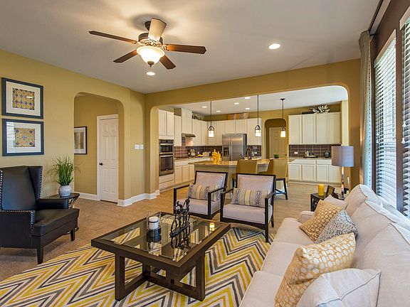 This beautiful two-story open floor plan features 9-ft. first-floor ceilings, a breakfast nook and spacious living/dining area. The modern kitchen offers Woodmont raised-panel maple cabinets, granite countertops and tile backsplash. Upstairs, the expansive open game room provides an ideal space for a media or study area. The master suite showcases a separate sitting area, walk-in closet and adjoining bath with Silestone® countertops, a dual-sink vanity, garden tub and separate shower. Additional features include plush Shaw® carpeting at game room and bedrooms, tile flooring at baths, stylish vinyl plank flooring throughout the first floor, Generation Lighting fixtures, ceiling fans at family room, game room and master bedroom, Sherwin-Williams® low-VOC interior paint in Alabaster, Colonial 6-panel interior doors, a front yard sprinkler system, wrought-iron stair rail, 8-ft. entry door and smart thermostat. Unwind and entertain on the extended covered back patio.