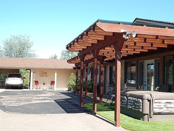- Exterior Features: Tall Pines on Lot, Porch/Deck, Landscaped, In the Trees, Covered Patio, View of Mountains, Patio, Panoramic Views, Work Shop