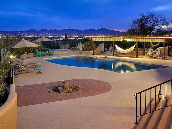 "Sellers will accept or counter offers $1,195,000-$1,250,000." ''Hacienda de Las Luces'' (the house of lights) high on a hill in Cobo Catalina Hills on 4.57 lush desert acres with sweeping city, mountain and best full views of the sunset in Tucson throughout the year. Located in Tucson's near north side in a privacy/equestrian designed subdivision of SR (3.3 acres+) lots, this outstandingly remodeled home offers it all..the Hacienda complex includes iron gated entry, exposed aggregate driveway, fully fenced property, main house w/4395 sqft, gourmet kitchen, gracious master suite, detached two bedroom full guest house w/1159 sqft, detached studio w/520 sqft, workshop, full tennis court, pool, spa, ramada, RV parking, abundant desert flora, fauna and a bird watchers paradise.