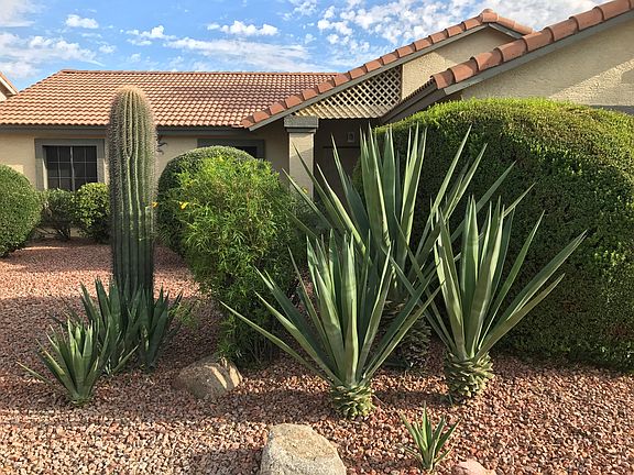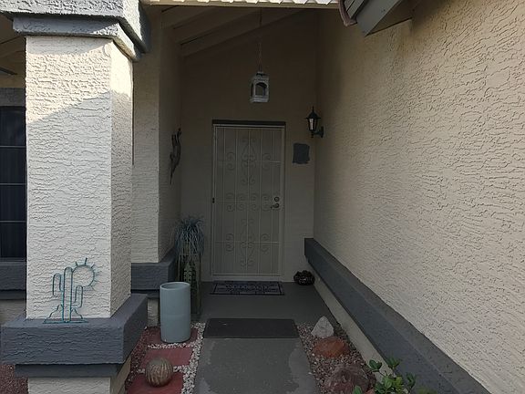 Comfortable, clean and regularly remodeled single story patio home with 2 car garage, large extended back patio and authentic brick fireplace with outdoor ash removal. Porcelein tile throughout with recently installed new carpeting in much of house. Newly remodeled master bath & shower. Goegeous & Lush backyard with emerald green lawn, cactus/palm/agave varietals, and one grapefruit tree.
