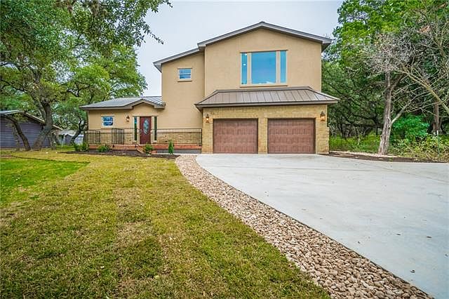 Custom home w/ small lake view near Crosswater yacht club! No HOA. Just outside Lakeway boundary, great trees, level lot. Bright & open, designer features, crisp finish out. Downstairs master ste, private entrance, huge walk-in shower & closet. 2nd Master or optional entertainment area upstairs. Stylish kitchen w/ tons of cabinet & counter space, built-in wine rack & bkfast bar. Oversize garage w/ work area. Efficient design, custom attic storage. Great outdoor living, perfect for entertaining.
