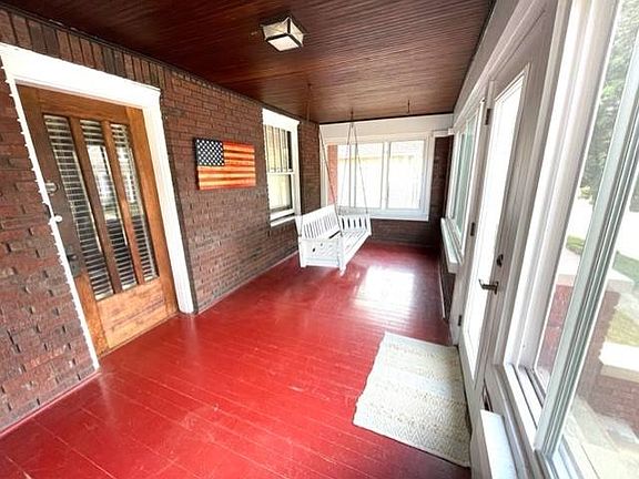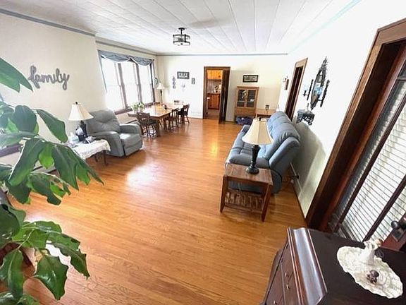 Entrance: Large front porch has thermopane windows, brick walls, hardwood floor. Living Room/Dining Room: This large open room is perfect for family gatherings, oak floor, painted walls, natural woodwork and lots of natural sunlight. Kitchen: Cozy with knotty pine cabinets and country hinges. Newer kitchen faucet, backsplash is mosaic tile which compliments the counter top. Stove and refrigerator included. Bedroom: French doors separate the living area from this bedroom. Closet, hardwood floors. Next two bedrooms also have painted walls and hardwood floors and closet. Back bedroom is up 5 steps to a huge bedroom with lots of natural sunlight, painted walls, closet, and vinyl floor with wood look design. Basement: Large windows make this basement excellent living space. Second kitchen in basement has sink and snack bar (refrigerator not included in basement), white paneling on walls, laundry chute from upstairs bath. Red floor, heated with gas radiators, plus a second gas wall unit. Wood burning fireplace, storage cabinets of knotty pine on the west end of this room. Perfect for family gatherings or a teens area. Bath: This bath has white fixtures, with nice shower, pocket door and is convenient to the family area in basement. Next to it are hookups for washer/dryer (included in sale) and lots of storage space. ALL NEW WIRING that was professionally installed at a cost of 17K, gas water heater, boiler for gas hot water heat for this home, which is an efficient way to heat the home. 6 window air conditioners all in good condition can "zone" cool this home to save $ rather than cool every room all day. 1 car attached garage is compact but convenient. Storage area in back of garage for mower, bicycles, tools. Nice yard has garden space. ONLY 2 BLOCKS FROM SCHOOL!