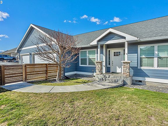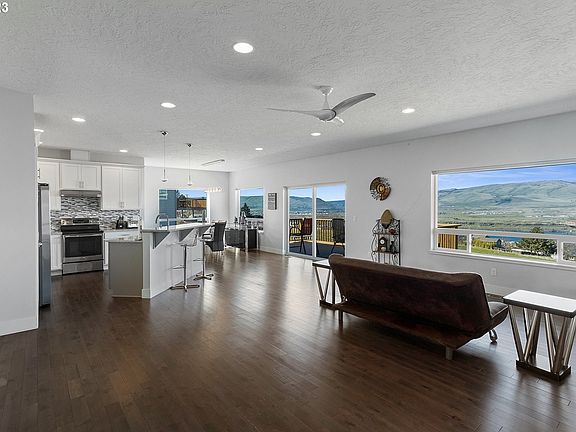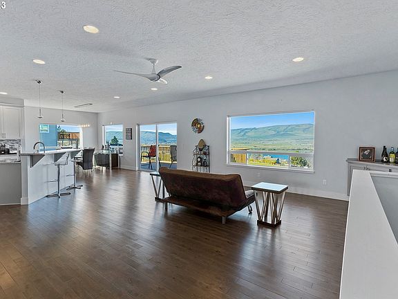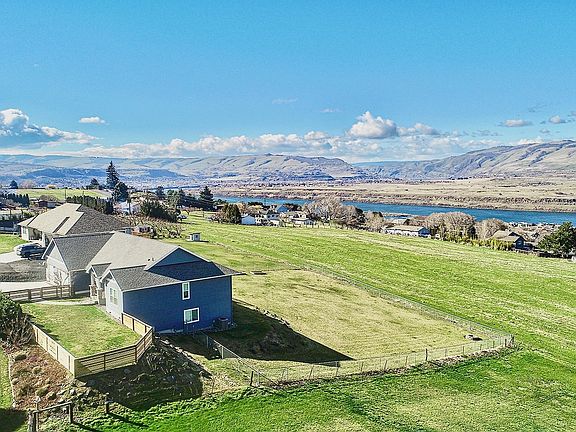 Custom built home with views of the Columbia River gorge and The Dalles dam. Built in 2015 this spacious 4 bedroom 3 bath home sits on a .61 acre fenced lot with impressive views. The home offers an ideal layout with the master and 2 more bedrooms, office, laundry, kitchen, living and dining room all on the main level, plus a bonus gym or second office, bedroom and enormous downstairs family room with access to a fenced backyard, raised garden beds and fire pit. This property is located on the east end of town on a private street making it a desirable property to call home with ample storage, oversized 3 car garage, and great location! The primary suite offers a spacious room, large walk in closet, built in vanity and tile walk-in shower. The kitchen offers incredible views, granite island and counters, stainless steel appliances and pantry. This home is one of kind, move in ready and in great condition. Please inquire for more details on the shared well and septic.