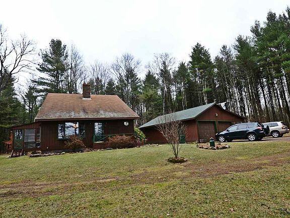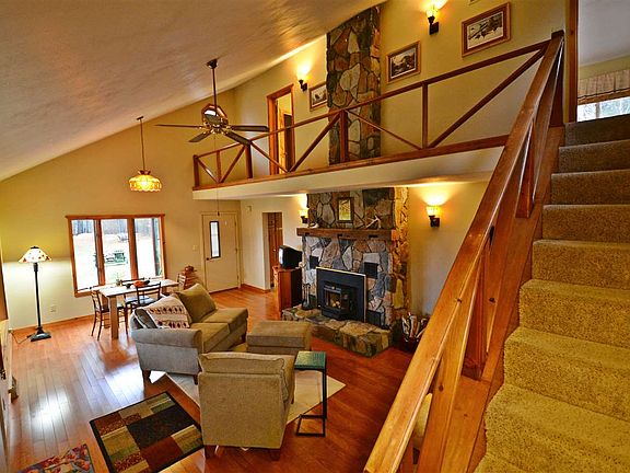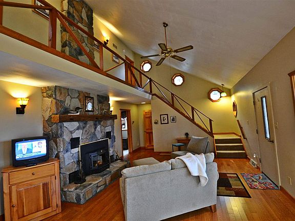 Private open concept home w/ large stone central fireplace. Kitchen features beautiful granite counters. 1/2 bath is plumbed for tub/shower or washer & dryer. Home sits back off the road on 5 private acres w/ gardens, landscaping, apple & pear trees, trails and more! 24 x 40 insulated barn w/ 60 amp sub panel, over head doors at each end, 2 11 x 11 horse stalls with dutch doors & storage for 400+ bales of hay. Property also features 26 x 30 insulated garage & 12 x 30 car port w/ lights & wood storage.