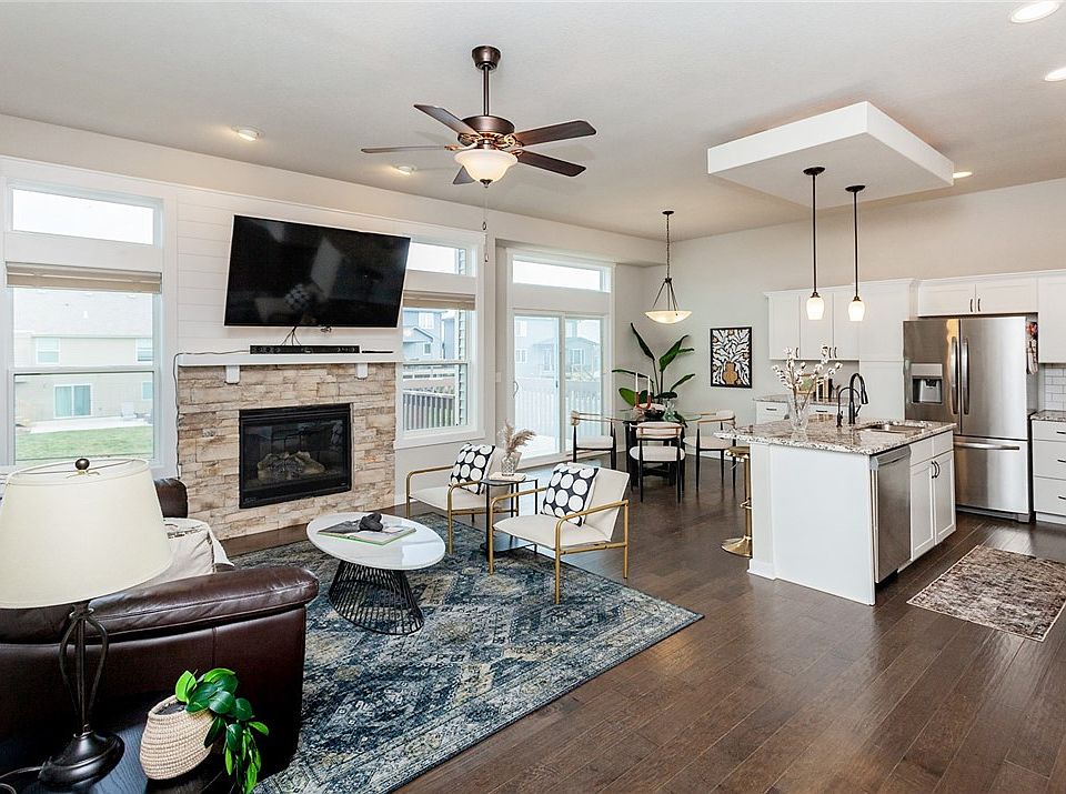 This beautiful walkout ranch has everything you've been looking for in Adel's desired Timberview West! The upgrades in this home are sure to impress! You're welcomed to an open concept modern floor plan w 10' ceilings, engineered hardwood floors & abundant windows. The great room features a stone gas fireplace, stained mission style trim & backyard views. The kitchen boasts a reverse osmosis drinking water system (fridge dispenser also connected), island, granite counters, tile backsplash, stainless appliances & crisp white cabinetry w added pantry cabinet & built-in desk. Off the kitchen, the dining area has slider access to the spacious deck w steps to the backyard & lower level patio. A split bedroom floor plan gives you a private primary en-suite w tray ceiling, dual vanity, custom tile shower & large walk-in closet. 2 addtl bedrooms w vaulted ceilings & fans share a full bathroom at the front of the home. The first of two laundry areas & a mudroom complete the main level. An entertainer's paradise, custom walkout lower level is perfect for game days & hosting holidays! The spacious family/rec area offers 9' ceilings, LVP flooring, slider access to the covered patio, dry bar & wet bar w 2nd full fridge & dishwasher, plus cabinetry w glass inserts & wine storage! Also find a large 4th bedroom, 3/4 bathroom w tile shower, 2nd laundry hookup & storage space downstairs. Enjoy a 3 car garage, high-efficiency HVAC & small town living within 15 minutes of big city amenities!