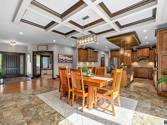 Welcome to a truly extraordinary property - custom-built, meticulously designed, and packed with luxury features rarely found in this location. Located on a spacious lot in a desirable west side neighborhood within the Jefferson High School district, this custom builder-owned masterpiece offers nearly 4,800 sq ft of thoughtfully crafted living space across three stunning levels. With 7 true bedrooms plus 2 dedicated offices on the main floor, this home is designed for maximum flexibility and function. Soaring ceilings, abundant windows, and an open-concept layout create a bright, welcoming environment that's perfect for both everyday living and large-scale entertaining. Architectural tray ceilings, custom stonework, and built-in sound throughout the home showcase the attention to detail found in every corner. The heart of the home is the expansive main floor living space, where form meets function. The spacious kitchen and living areas flow seamlessly out to a backyard oasis that redefines in-town living. A deck that spans the entire width of the home overlooks a private backyard retreat featuring a hot tub with privacy screening, covered lounge seating, firepit patio, and lush landscaping. Whether you're enjoying a quiet evening or entertaining guests, this outdoor setup delivers an unforgettable experience. But the showstopper? A completely custom Michael Jordan/SDSU-themed sports court - complete with basketball hoop and court striping - offering a recreational amenity few homes can rival. Back inside, the garden-level basement is a true entertainer's dream, with a large custom bar, full media and game areas, garden windows that bring in natural light, and a concrete storm room for added safety and peace of mind. Upstairs, five bedrooms provide generous accommodations, including a luxurious primary suite with an oversized walk-in closet that feels like a room of its own. A secondary suite on the upper level adds flexibility for guests, multigenerational living, or older children. The layout supports a variety of living styles, whether you're hosting, working from home, or just enjoying the space. The garage is a destination in its own right, accommodating up to 5 vehicles, with built-in storage, heating, and direct access to the outdoor deck - making it an extension of the home's living space. From construction quality and insulation to high-end finishes and livability, this home has been built with intention and precision. Every square foot is optimized for comfort, entertainment, and lifestyle - from the inside out. This is more than a home - it's a private retreat, entertainment hub, and one-of-a-kind residence in one of Sioux Falls' most sought-after areas.