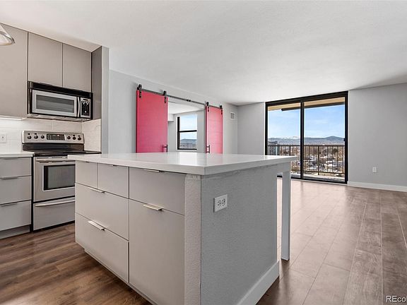 A vibrant city escape awaits in this Lincoln Park residence. Located within Denver Tower, a fully remodeled interior unfolds w/ new flooring and fresh wall color throughout. Natural light streams in through large windows creating a bright and airy atmosphere. An open kitchen shines w/ stainless steel appliances, cabinets extending to the ceiling and new countertops. Ample storage is offered in a pantry w/ pull-out drawers and an island w/ lower drawers. Sliding glass doors in the spacious living area open to a private balcony flaunting city and mountain views. Enter through a newly added barn door into a primary suite boasting a walk-in closet w/ adjustable shelving and a washer + dryer set. A secondary bedroom offers space for a home office. Two en-suite baths feature new shower tile, vanities and fixtures. Two covered parking space ensure security and accessibility. Residents enjoy access to luxurious building amenities including a fitness room, movie room, pool, spa and lounge. (Please see www.thelincolndenver.com/amenities for more info)