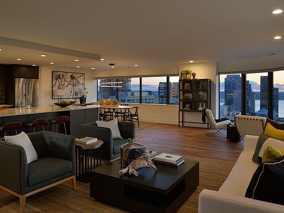 Highly sought-after NW corner in First Hill Plaza. Recently renovated 2 BD, 2.75 BA offers 2,100 sq ft. of fresh minimalist interiors by Seattle Interior Designer, Michelle Dirkse. Cool toned Walnut floors and dark oak cabinetry complemented by stunning white quartz countertops and Ann Sacks tile throughout. Stainless steel appliances and large white quartz peninsula opens into the great room providing views and space for entertaining. A multipurpose media room complete with built in shelving and cabinetry could be a 3rd BD. First Hill Plaza is known for its epic views, resort atmosphere and meticulous service. Rooftop glass enclosed pool, spa, full gym, rooftop party room, outdoor terrace with BBQ for grilling and tennis court. 2 pkg. and storage incl.