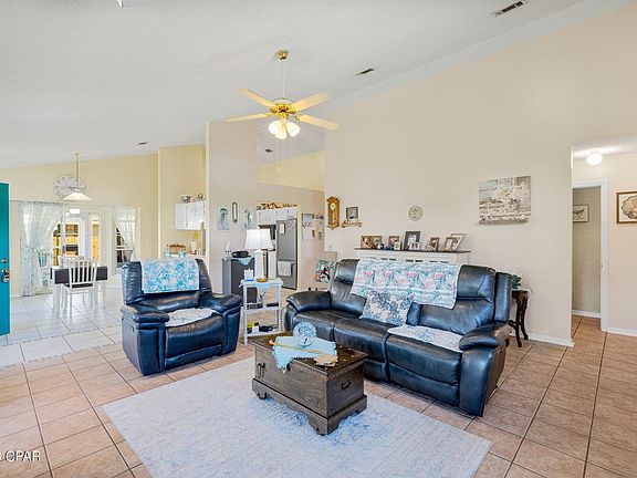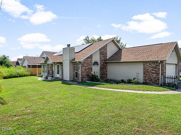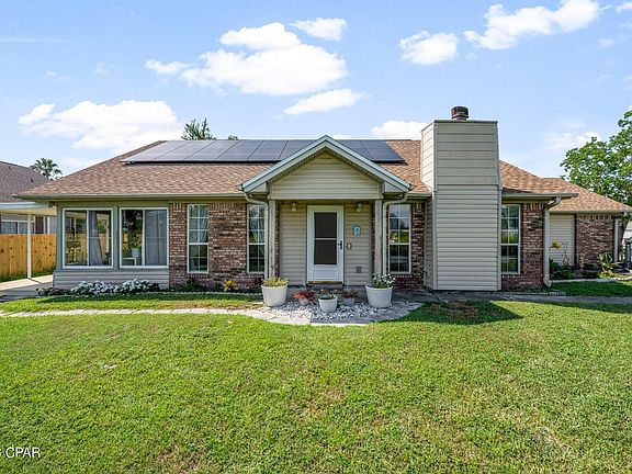 You will enjoy this light and bright 2 bedroom 2.5 bath home centrally located in the heart of Panama City. This home is situated on a corner lot and features 2 bedrooms that each feature an ensuite bathroom, cathedral ceilings, tile and lvp throughout, wood burning fireplace, large dining area, kitchen with newer appliances, breakfast bar, pantry, new walk in shower in master, walk in closet in master, sun room porch, covered deck and 2 car garage with pull down stairs and attic storage. The house has solar panels that will be paid off at closing that reduce the electric bill to a nominal base fee of $30 per month, the water heater is on gas, and the roof is 2009. The house has gutters as well. Washer and Dryer connection is in the garage. One of the highlights is the view from the living room of the utility easement. It feels very private and peaceful. A current survey is available. Book your showing today!
