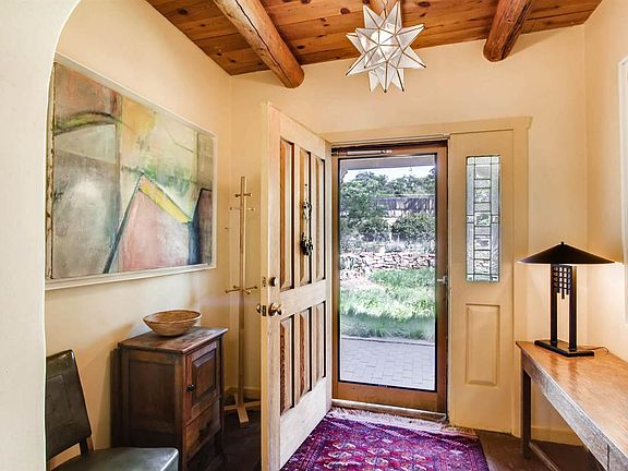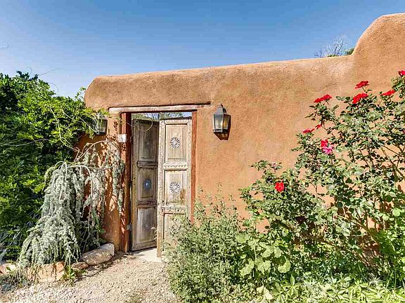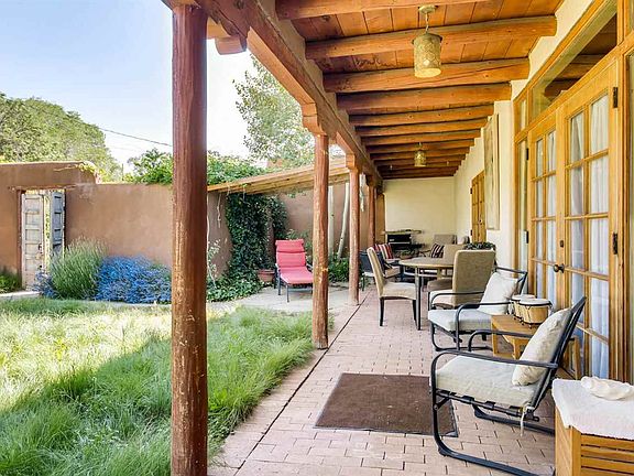 Beautifully-crafted home with attached guesthouse enjoys a feeling of peaceful serenity. An Eastside sanctuary in a gorgeous half acre setting. Treasured traditional details in the three-bedroom, two-bath main house such as white washed vigas, brick floors, charming fireplaces, deep set windows with lentls, and banco seating, an arched antique window, nichos, and kitchen fireplace add to the interiors warm elegance. The sun splashed light casts through scattered skylights and windows with exterior doors from almost every room onto tree and vine shaded portals. The property includes the attached guesthouse on the lower level that can also be accessed from inside the main house. Both have a successful rental history, currently set apart for privacy. A rare offering, on half acre, minutes from downtown Santa Fe with easy access to Dale Ball trails and the Nature reserve trail with a year round river running through. The separate, attached guest house on lower level has one bedroom, 1 bath, kitchen, and a garage bay that could be added square footage or future studio. Property also comes with a secondary two car garage that is currently leased. Located in the Historic Eastside; property is "noncontributing" status.