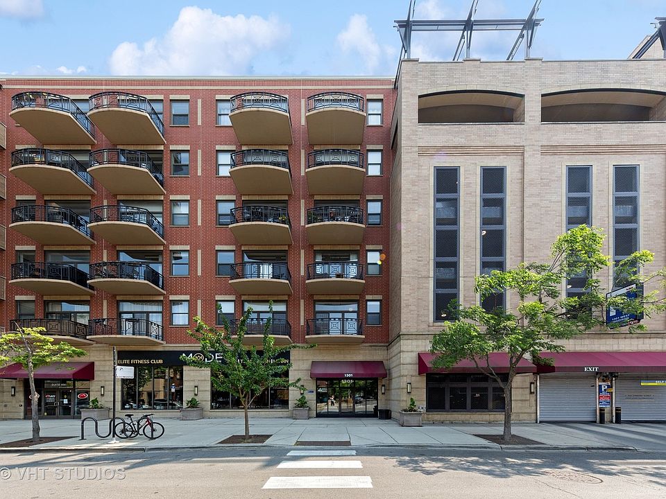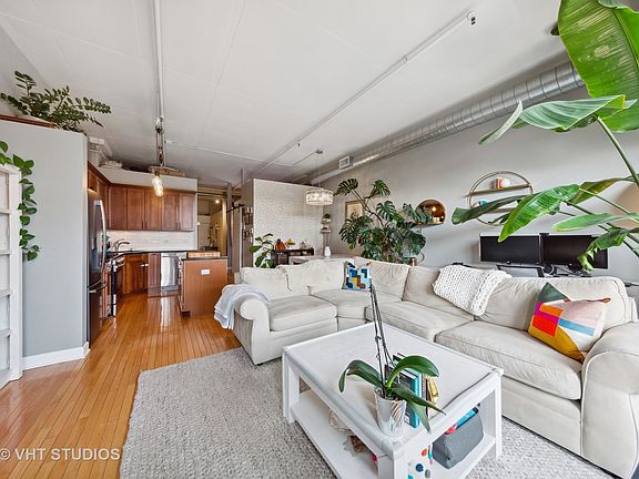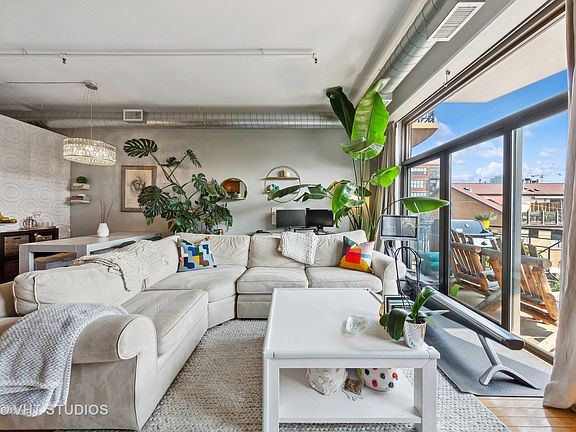 Bright and sunny south-facing 2 bed/1 bath condo overlooking magnificent courtyard at Block Y. This chic loft offers a gorgeous kitchen with granite counters, shaker cabinets, island and newer stainless appliances. A living space large enough for a separate dining room is highlighted with a design-driven tile wall and stunning chandelier. The large bath has a soaking tub, dual vanity and plenty of storage space. The spacious primary bedroom contains ample closet space and comfortably fits a king bed. The second bedroom is highlighted with a sliding barn door. A high efficiency furnace and AC unit was just installed. The unit is completed with a balcony that receives sunlight all day long and is a gardener's delight. INCLUDED prime garage parking! Block Y features a private, serene courtyard with reflection pond. Close walk to Skinner Park, tennis courts, restaurants, five star dining on Randolph St & Madison Row, Whole Foods, & Mariano's. Convenient to L, bus, and expressway. Welcome home to this gorgeous loft nestled in the heart of the West Loop!