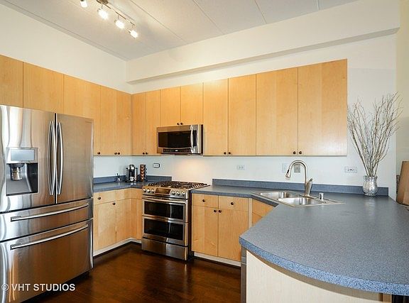 Very spacious and open floor plan, 1026 square feet 1 bed, 1.5 bath in the West Loop. Close to restaurants and nightlife. Several upgrades include top-of-the-line Samsung appliances, in-unit full-size washer/dryer, new air conditioning unit with Nest thermostat and hardwood floors in main living area. Come home to your quiet, south facing, sun drenched condo with light-filled living & dining room with gas fireplace. 6x12 balcony with gas hook-up and view. 11 foot ceilings, heated hardwood floors and carpeted king size master bedroom with walk-in closet. Master bath includes double vanity and Jacuzzi tub. Assessments include everything except electricity. Indoor garage parking and locked storage closet included. Live in a small intimate building with elevator in one of Chicago's most desirable neighborhoods!! Elevator Buildiing