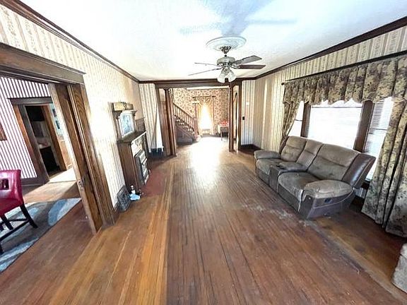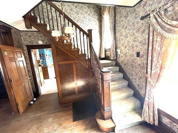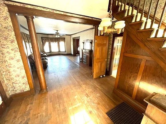 Entrance: Glass enclosed front porch with carpet that leads to beautiful foyer. Foyer: Open staircase with natural woodwork, hardwood floors. Living Room/Dining Room: Continuous hardwood floors, wallpaper walls, decorative fireplace mantle and lead glass bookcase. Pocket doors to dining room with more natural woodwork, lead glass china closet. Kitchen: Sunny kitchen has oak cabinets, white appliances included, vinyl flooring, walk in pantry. Enclosed back porch entrance. Upstairs: 4 HUGE bedrooms with ample closets. Bath: Full bath upstairs and half bath on main level. Basement: Dry basement has 2 finished rooms, lots of storage space plus utility area. Yard: 1 1/2 lots, 4 car garage! Deck with gazebo, all within walking distance of school for your family. Roof about 3 years old and thermopane windows plus vinyl siding too.