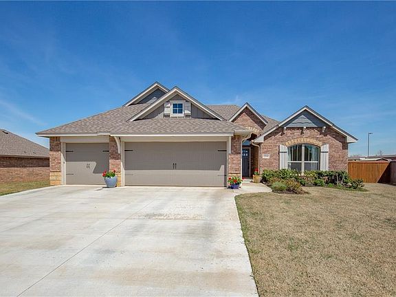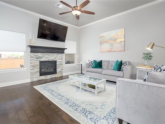 You have to see this one! Beautiful both inside and out, with a brick-and-stone exterior that catches the eye. Notice the wooden shutters and the stone detail above each arched window. The kitchen is a gem, with a built-in gas stove, white cabinets with glass doors, under cabinet lighting, contrasting island and a huge walk-in pantry! Little touches, such as the carriage garage doors and indoor fireplace, lend charm to this modern home. With no neighbors behind you, enjoy a nice-sized yard that's completely fenced in. The covered back patio lets you enjoy your outdoor space, rain or shine. Inside, you'll find it's spacious, light and airy due to the tall ceilings. Key details include gorgeous upgraded lighting, wide-plank hardwood floors, a fireplace and high-quality tile in the bathroom. Notice the coffered ceiling detail in the master bedroom, the wonderful walk-in closet, and the spa-like bathroom with double sinks, a jetted tub with separate shower stall, and ample storage.