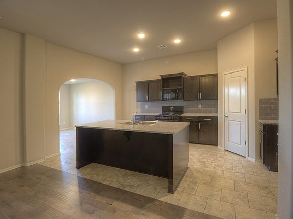 Beckett Traditional Floor Plan - 4/2.5/2 - 1 story - Modern white exterior w/ black windows & coach lights. Open concept. Kitchen features granite counters and tile backsplash, large island w/ pendant lights, stainless gas appliances, siligranite single bowl sink, painted cabinets to ceiling w/ matte black hardware. Dining area with barn doors. LVP flooring thru-out. Private master suite with walk-in closet w/ out of season storage, large shower & dual vanity. Covered back patio. Energy efficient design.