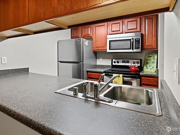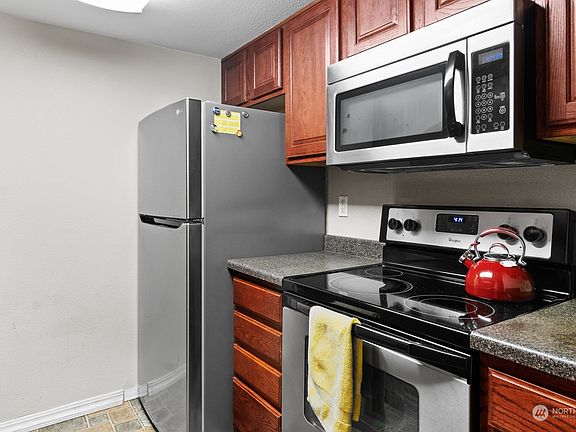 New $5000 Buyer Credit - This cozy second-floor condo offers the perfect blend of comfort and convenience. Nestled in a tranquil community with well-maintained grounds, you'll enjoy the park-like atmosphere. Inside, relax in the light-filled living room and cozy fireplace or relax on your spacious east-facing sun deck. The primary bedroom features a generous walk-in closet, and the second bedroom is versatile, perfect for use as a home office or guest room. Brand new fridge and water heater. This unit is move-in ready condo. Plus, benefit from easy access to Boeing, Mill Creek Town Center, and major highways. You'll also have a dedicated parking space plus extra storage. HOA fees include W/S/G, play area, landscaping, and clubhouse access.