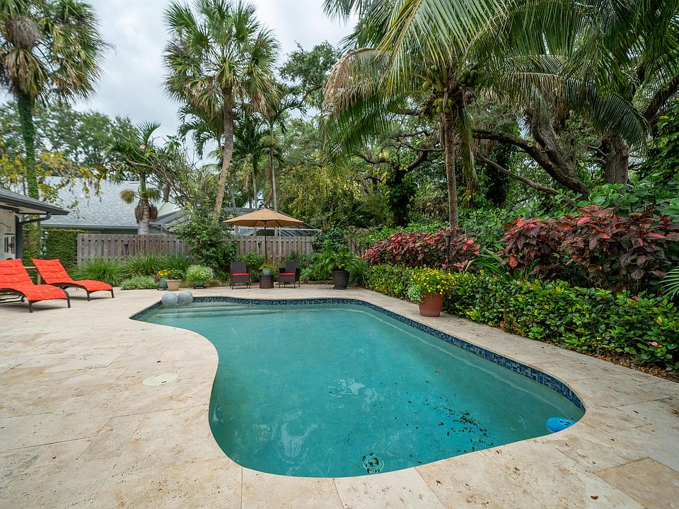 RARELY available Frenchmans Cove home E of Prosperity Farms. This 3 bed, 2-1/2 bath home has been meticulously maintained. As you enter, the Hickory wood floors (2018) & high living room ceiling make this home warm and inviting. Kitchen boasts granite counters, stainless steel appliances & a gorgeous bay window that draws you out to the private, backyard oasis. The pool was refinished and hi-end travertine was designed for usable outdoor spaces on 3 sides. The Interior/exterior was painted in 2019. Newer landscaping (2020) w landscape lighting (2022) and newer sprinkler system (2020). The roof is only 13 years old. Water heater (2022). A/C approx 6 years old. Front door/windows/sliding doors/garage doors all hurricane rated. Partial home generator included.