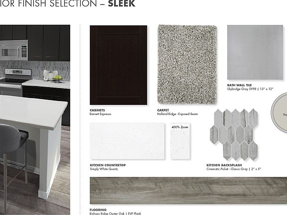 The Briscoe has an open single-story layout with an impressive kitchen. Espresso cabinets with cotton white quartz countertops, cool grey EVP flooring and multi-tone tweed carpet in our Sleek package.