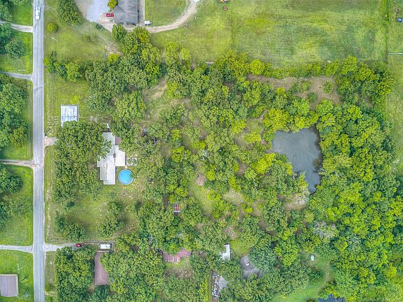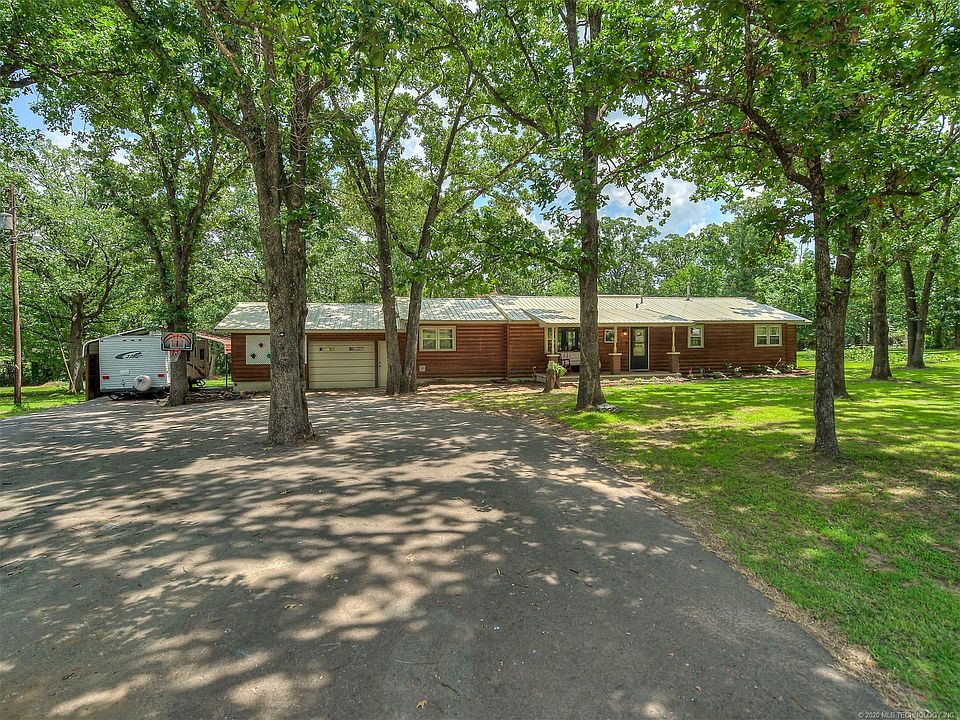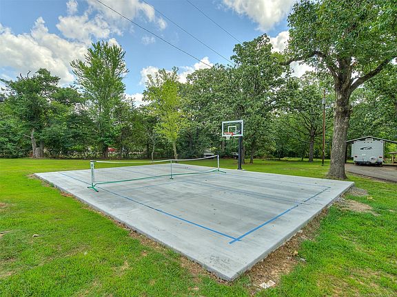 Cabin style home with a pond on 5 +/- acres in Coweta! Looking to get out in the county with quick access to shopping and amenities? Look no further, this 3 bed 2 1/2 bath is just 8 1/2 miles from shopping in BA and 2 1/2 miles to downtown Coweta. New roof, floors, HVAC, paint and deck. Above ground pool, 30x40 basketball/tennis court, shed, barn, RV hookup, carport and so much more! Garage has been converted to theater room and included in square footage.