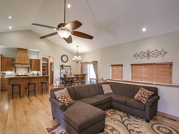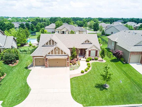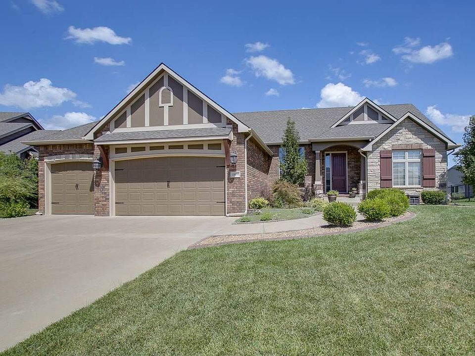 Well cared for one-story in the heart of Reed's Cove. This exceptional property offers tasteful finishes inside and out! With 5 bedrooms, 3.5 baths and over 3700 square feet there is plenty of room for all. The main floor offers an expansive feel and open design with soaring vaulted ceilings, hardwood flooring and perfect flow. Your main floor living area features a gas fireplace, built-ins, and formal dining space. The kitchen is outfitted with gas range, maple cabinetry, island, walk-in pantry, granite counters, and informal eating space. Added convenience can be found with main floor laundry, half bath for guests, and easy access to the covered deck with eastern exposure. The split bedroom design provides enjoyable privacy for the master suite which includes an en-suite bath with his/her sinks, walk-in closet, tiled shower, and new flooring. Two sizable guest bedrooms are great for kids and have access to a jack and jill bathroom arrangement. The lower level is spacious with a cozy family room, plenty of space for game tables, wet bar, two large bedrooms, and a full guest bathroom. As a bonus, two finished rooms (no egress) can be utilized for various needs such as a play room, study zone, or storage space. The fully fenced yard comes with a sprinkler system and irrigation well. The mid-level walk out has access to a large concrete patio. Reeds Cove is situated in the Andover School district and offers great neighborhood amenities such as pool, playground, club house, and 15 acre pond with walking paths, along with easy very quick access to Trinity, Magdalen, highways, and the best of East Wichita. Seller has made several recent improvements including new carpet in various areas, irrigation well, granite counters in baths, new tile flooring in master bath. Please note there is no real estate sign in yard.