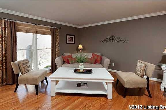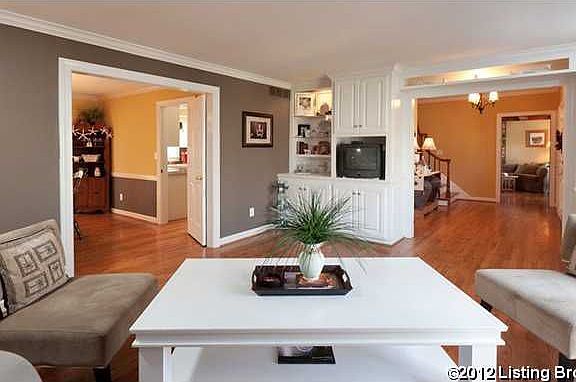 This Gracious and comfortable home will warm your heart from the moment you walk in! As you drive up you cannot help but see the gorgeous grove of trees with perfect placement in the front along with the lighted landscaping. Plus you have the best of all worlds, not only is it stunning but sits in the Award Winning Oldham County School Campus School District! As you enter the beautiful foyer you are welcomed by the beautiful hardwood floors that abound the first floor. The spacious living room (17x13.5) features crown molding and custom lighted built-ins. Your first floor den (18.5x13.2) allows you to cozy up to the brick fireplace. This fantastic floor plan continues into your updated kitchen (2010), cabinetry is off white with toffee stain, tiled back splash, pendant lighting and planning desk with eat in area with bay window, and formal dining room. On nice evenings you have the option of relaxing out in your screened in sunroom. Custom window treatments will stay. Upstairs are 3 la