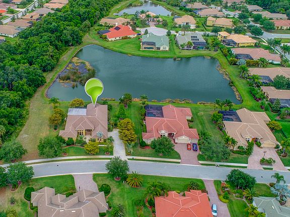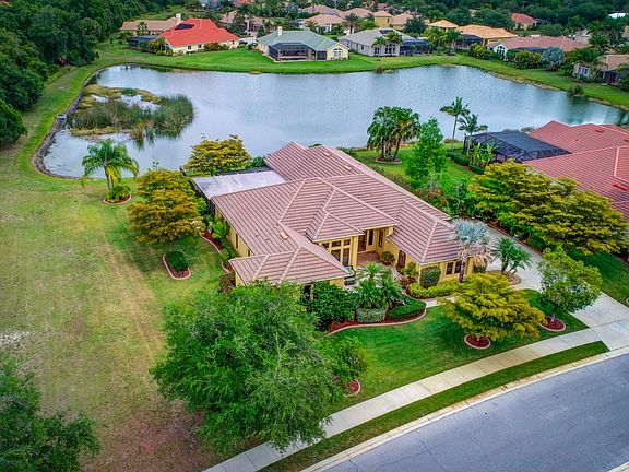 Classy elegance and distinguished details present this custom-built Sam Rogers home idyllically poised on a peaceful lakefront. The tropical landscape enhances the curb appeal and invites you inside the double door entry foyer to spectacular craftsmanship. Fine decorative embellishments, distinct architectural details, posh finishes, and generous spaces present sophistication and comfort. This gorgeous home features 10' high ceilings throughout, upgraded lighting & designer ceiling fans in every room, walnut wood flooring in select areas, wide baseboards, 12' double tray ceilings & so much more! The gourmet kitchen has a casual dining area just off the formal living room that will invite any chef to create a delightful feast. The raised solid wood panel cabinets with seeded glass accents & glazed finish along with stainless steel appliances, solid surfaces with glass-tiled backsplash truly distinguishes the kitchen. The GE Monogram 48" side by side double oven gas range makes holiday meals quick! The prep island with farm sink will allow for having that sous chef alongside. Gorgeous formal dining sits tucked away from the living area with a butler pantry & extended server buffet. The split plan offers solitude in a grand master suite with 3 walk-in closets, a large soaking tub, walk-in shower, comfort height designer vanity, & spacious bath area. Two other bedrooms on the other side of the home are nestled by the family room to the rear of the home with the privacy of a pocket door. Within this wing the second bath allows guests to have their own en-suite and functions as a pool bath as well. The fourth bedroom located to the front of the home is currently being used as an office featuring French doors, transom windows, and powder room access. The oversized Florida room is air conditioned and has lots of flex space to serve any purpose. If you are looking for lots of space for family gatherings or need to work from home--your search is over. An additional oversized game/bonus room in the front of the home can easily become a 5th bedroom or use for home schooling. The home has been professionally landscaped along with landscape lighting surrounding the home. With preserve views on one side & water views in the rear allow for a pool to be easily added. A fenced backyard is perfect for your furry family members to roam free. Tax bill includes CDD. Greyhawk Landing is a 24-hour guard-gated community with A-rated schools nearby. The community has several nature trails, 2 community pools, water slides, splash pool, fitness center, spacious clubhouse, lighted basketball courts and fishing pier. All within a short walk. Easy access to Lakewood Ranch and I75. Schedule your showing today!