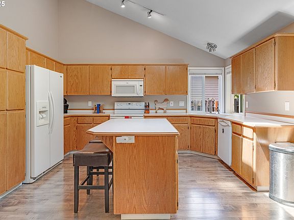 This two-story Tigard home offers a clean, functional layout with just the right mix of space, light, and privacy. A covered entry and skylit foyer lead into a light-filled living room with a large picture window and a dining area accented by built-ins. The kitchen stands out with vaulted ceilings, a large skylight, ample cabinetry, and a central island. Step through the sliding glass door to a fully fenced, private backyard that feels like a quiet retreat. Downstairs, a spacious family room with fireplace adds extra living space and connects directly to the 2-car garage. Upstairs, you’ll find all three bedrooms, a hallway bath, and a dedicated laundry room. The primary suite features a walk-in closet and a well-appointed en suite bath with double vanity and a custom-tiled step-in shower. Balanced, bright, and practical—this home checks all the right boxes. New carpet to be installed/replaced prior to closing.