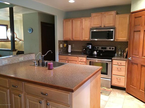 The house with the huge globe willow in front, has great bones!! Upstairs are the bedrooms and living space, with a really nice re-modeled kitchen. Step out the sliding doors to a deck and big fenced yard. A family room with cozy pellet stove downstairs has tons of oak built-in cabinets for storage. A place in the bar would fit a "kegerator" perfectly. A little extra TLC will make it yours!